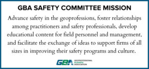 Interested in getting involved? Contact GBA Committee Coordinator Stacey Moore at stacey@geoprofessional.org to learn more about joining the Safety Committee. If you are interested in any other GBA Committee as a way of engaging with other geoprofessionals and giving back to your profession, contact Stacey or find more information here: Join a GBA Committee.